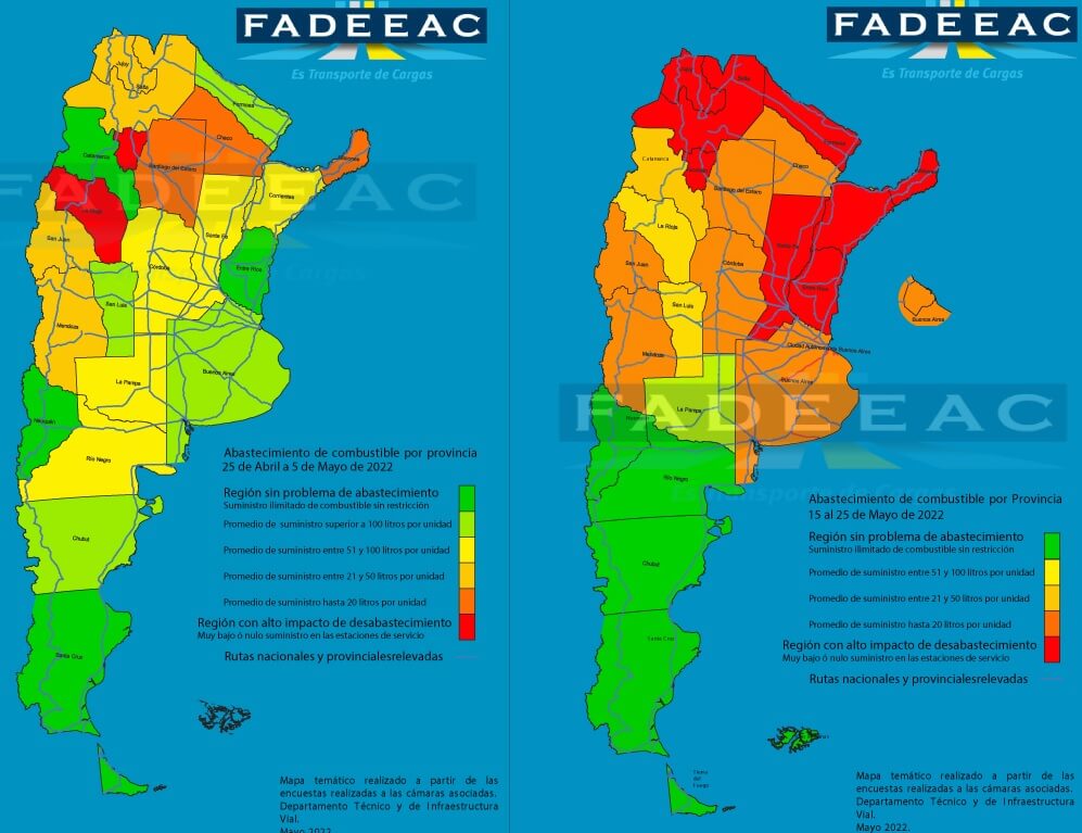 Y también Fadeeac difundió el mapa de los últimos días de abril y primeros días de mayo, cuando el panorama era mucho mejor, lo que permite comprobar que la situación empeora con el paso de los días.