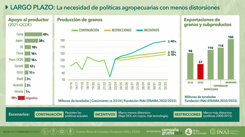 En el mismo observaron que “es posible alcanzar hacia 2032/33 un volumen producido de 155 millones de toneladas en un escenario de continuidad de políticas, o uno de 188 millones de toneladas de contar con mejores políticas agropecuarias”.