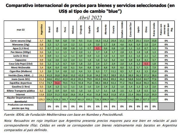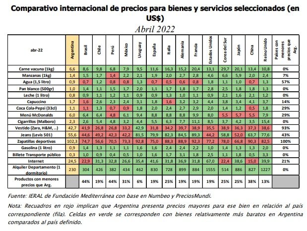 El Instituto de Estudios (IERAL) de la Fundación Mediterránea difundió un informe en el que analiza los precios de diversos productos en Argentina, comparados con los que se pagan en otros 14 países.