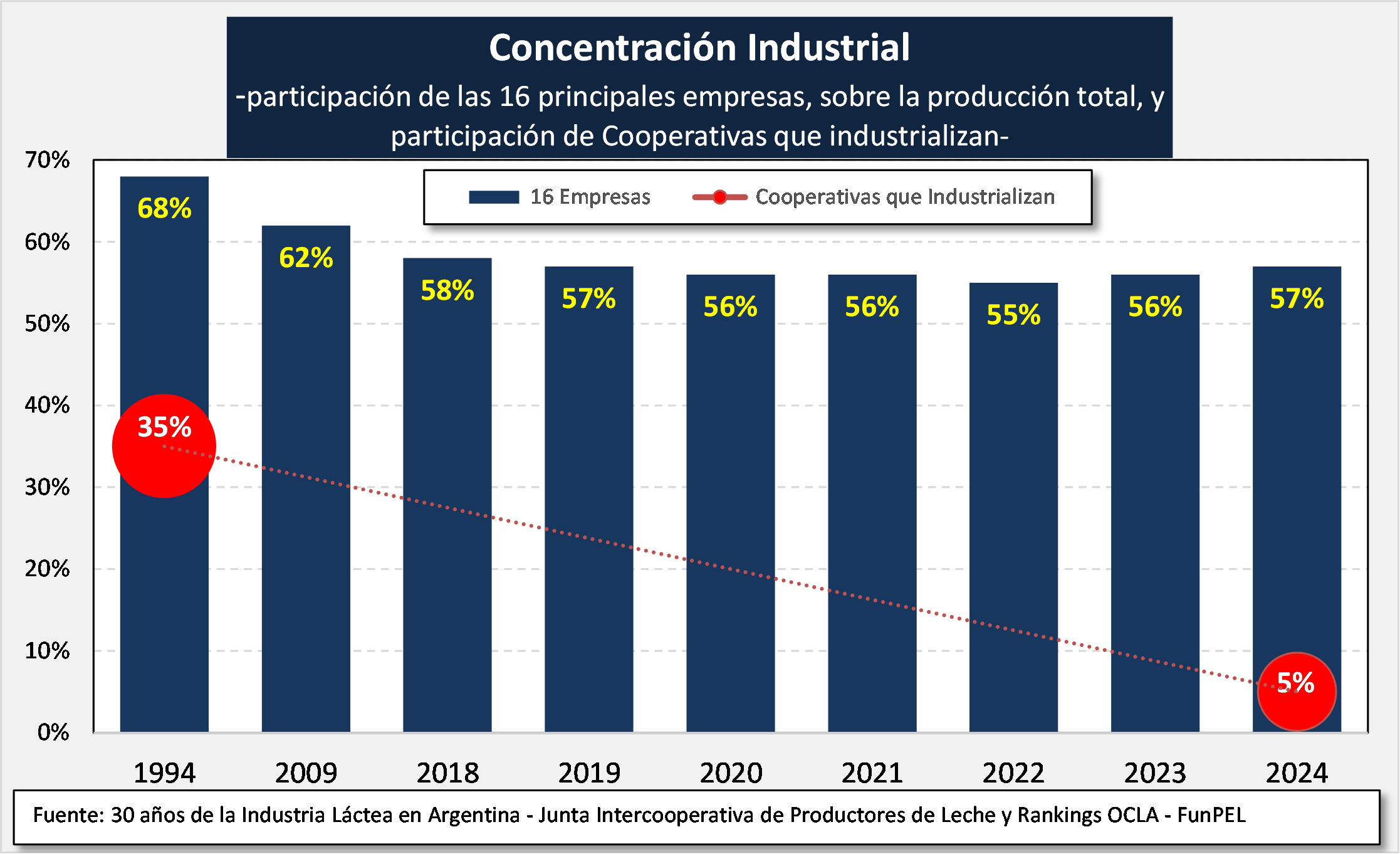 “La principal empresa en Argentina recibió el 12,5% de la leche total, ese valor en los principales países lecheros mundiales está en el rango del 25 al 90%. A mediados de los años 90, en Argentina la empresa N°1 del ranking recibía el 23% y el Top 5, el 55%”, agrega el reporte.