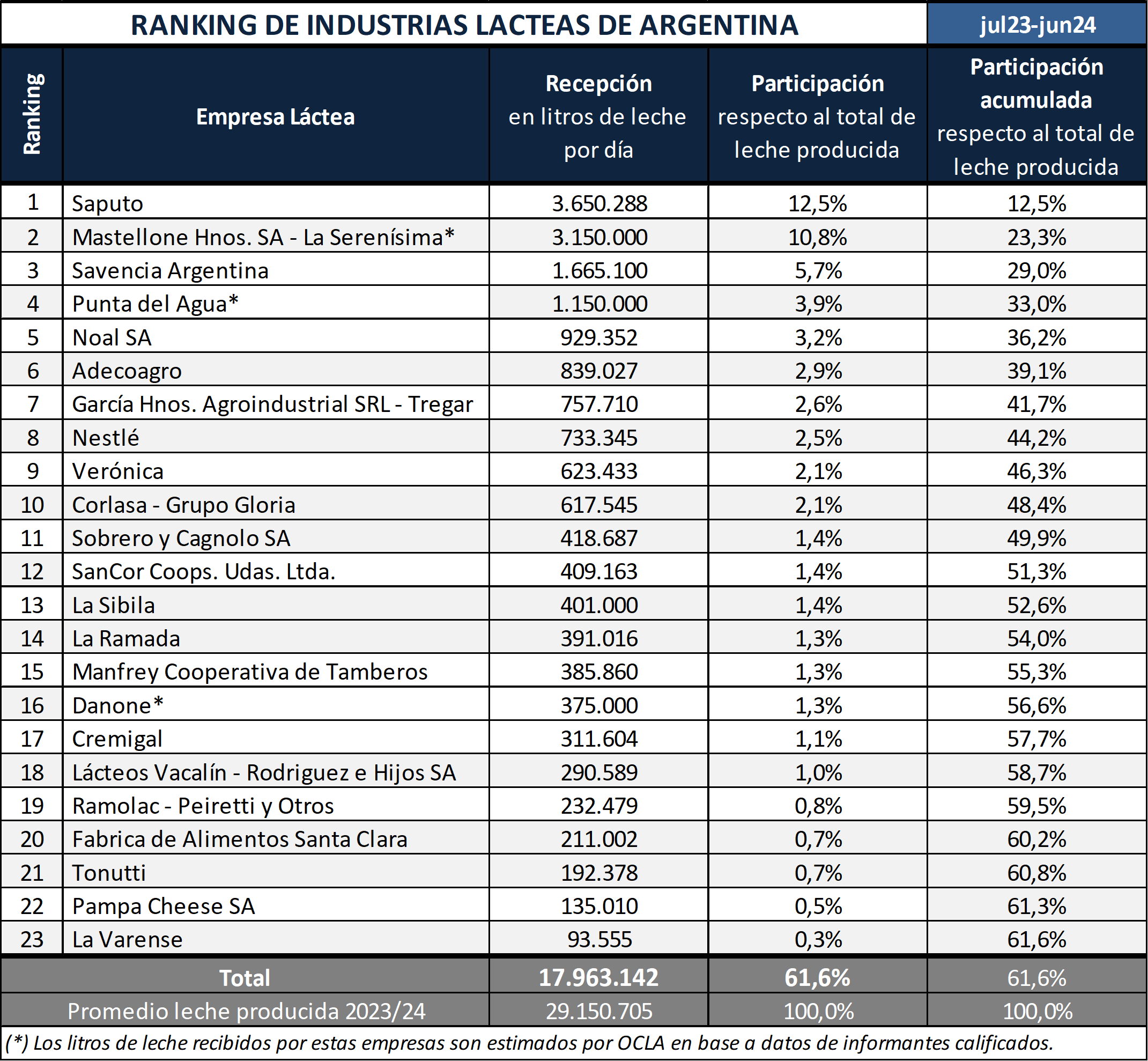 Se trata de un listado que elabora cada año el Observatorio de la Cadena Láctea Argentina (OCLA), en base a la información provista por las propias empresas –por secreto estadístico, no hay datos oficiales–sobre la cantidad de leche que reciben y procesan cada día en sus plantas.