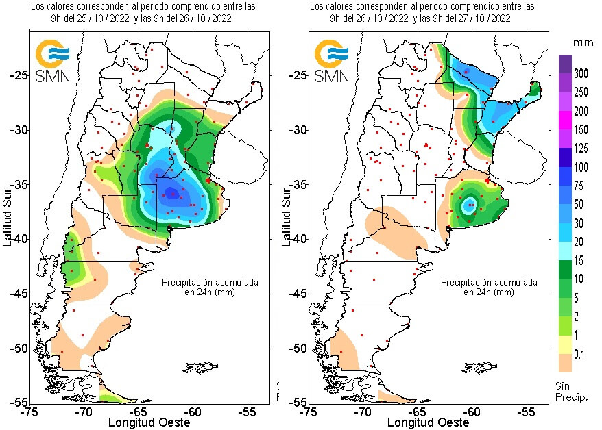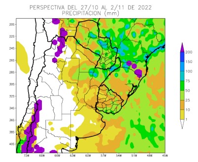En este marco, solo la mayor parte del área agrícola paraguaya, la mayor parte de la Región del Chaco, gran parte de la Mesopotamia y la mayor parte del Uruguay recibirán precipitaciones moderadas a muy abundantes (10 a 75 milímetros), pero con muchos focos con valores escasos.