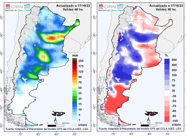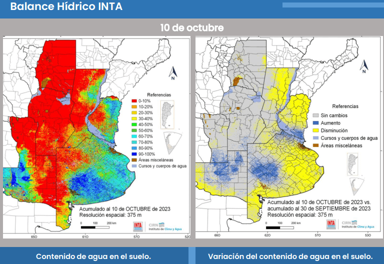 Del mismo modo, el INTA señala que “el modelo de balance hídrico, calculado a partir de información edafológica, climática y satelital, estima un contenido de agua útil entre un 60 y 90% en las provincias de Santa Fe (noroeste), San Luis (suroeste), Entre Ríos (noroeste), La Pampa (centro y oeste) y Buenos Aires (centro, este y sur); mientras que en La Pampa (oeste), San Luis (sur) y Buenos Aires (sur) el contenido de agua útil se encuentra en valores próximos al 100%”.