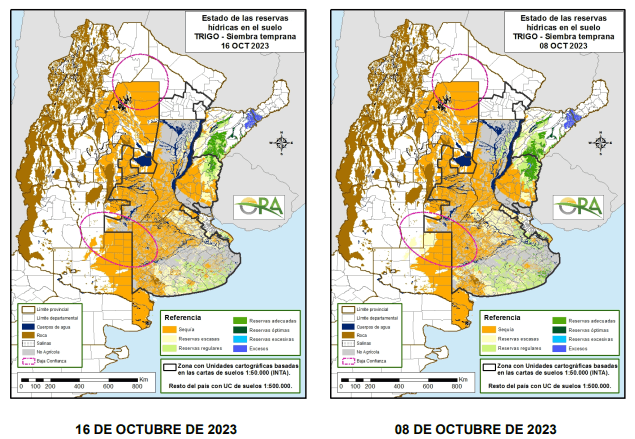 Por ejemplo, el mapa del estado de las reservas de agua en suelo de la ORA muestra que, salvo una pequeña franja del norte de Entre Ríos y sur de Corrientes, donde el trigo prácticamente no se culeitva, en el resto de los territorios agrícolas predomina la sequía y las reservas escasas o regulares.
