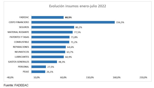 Los rubros que más impactaron en esta suba fueron seguros, material rodante, reparaciones y neumáticos. Solo en julio, el índice de costos elaborado por la entidad tuvo una suba de 8%, luego de aumentar 10,5% y 8,5% en mayo y junio, respectivamente.