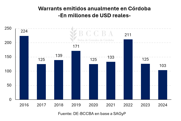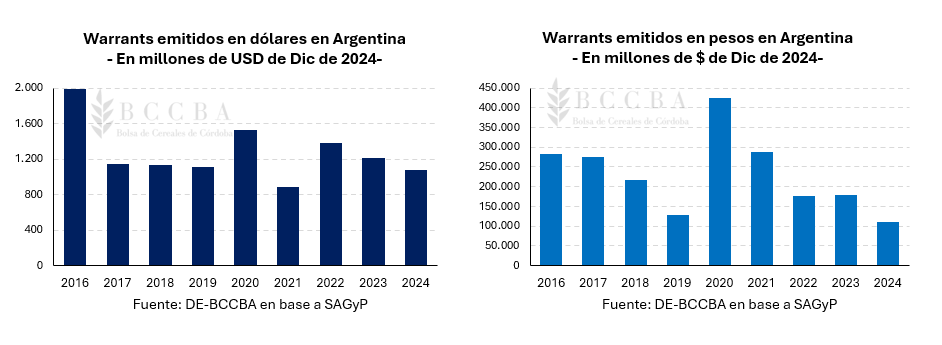 De acuerdo a un relevamiento de la Bolsa de Cereales de Córdoba (Bccba), el año pasado se emitieron warrants en dólares por un total de U$S 1.076 millones y en pesos por un total de $109.000 millones.