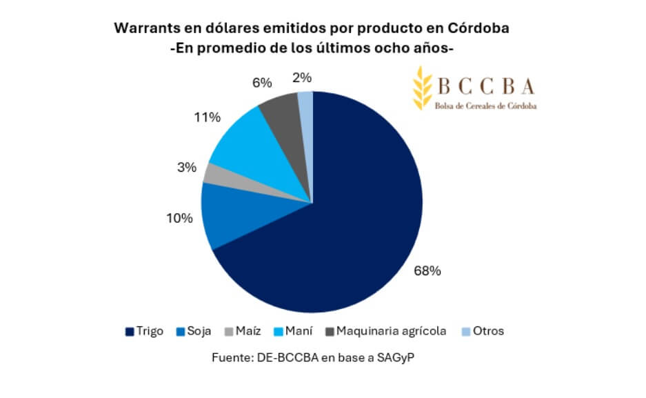 En 2024, en Córdoba se usaron cinco productos como garantía para la emisión de warrants. El trigo representó el 85,7%, la soja un 4,6% y el maíz acumuló 3,3%. Otros productos fueron la manteca y el queso, con participación inferior al maíz.