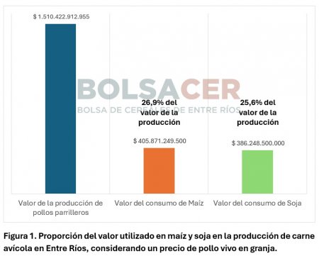 Esta producción requiere del uso de maíz y soja como insumos para la alimentación de las aves. “En el caso entrerriano, para el total de dicha producción, en 2024 se utilizaron 1.919.013 toneladas de maíz y 1.170.450 toneladas de soja, de acuerdo con las estimaciones realizadas”, advierte el informe.