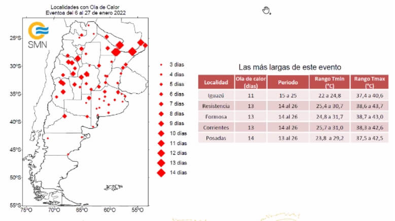 A lo largo de estos 21 días, de acuerdo a los datos del Servicio, las temperaturas extremas se extendieron de sur a noreste de manera paulatina. En 69 de 96 estaciones meteorológicas con datos climáticos registraron un evento de ola de calor en algún momento de esta ventana de tiempo.