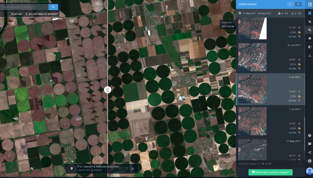EOS Land Viewer proporciona una amplia variedad de imágenes satelitales multitemporales y de productos derivados que pueden utilizarse eficazmente en las tareas de análisis, supervisión y gestión de recursos agrícolas.