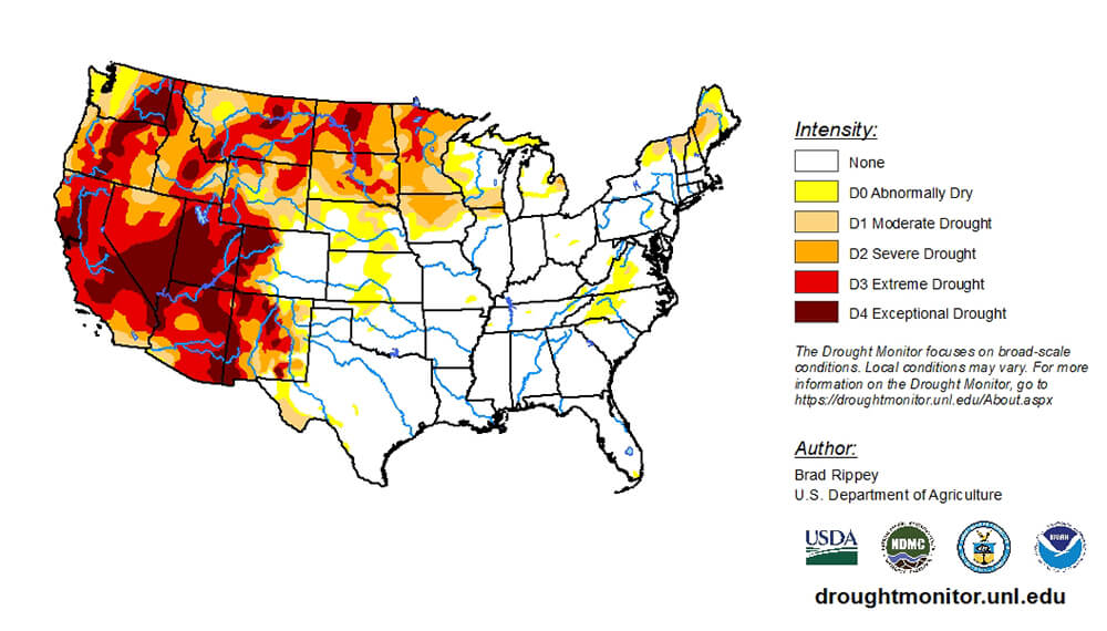 En las áreas más secas del norte y oeste de los Estados Unidos, el impacto de la sequía en los suministros de agua, así como en los pastizales, se vio aún más amplificado por el calor continuo.