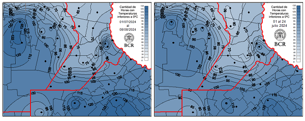 “La actualización del mapa de horas acumuladas con temperaturas por debajo del cero muestra que hubo un incremento de 5 a 10 horas bajo esas condiciones en los últimos 15 días. En el oeste (de la zona núcleo), aún más”, subraya el reporte de la GEA.