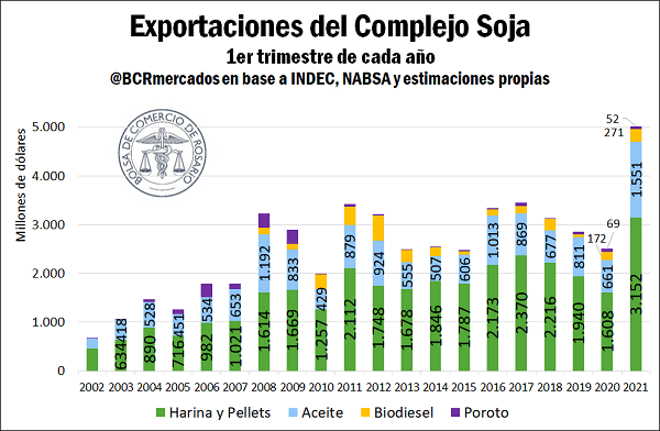 En los primeros tres meses del año se observaron exportaciones del complejo soja por más de 5.000 millones de dólares, lo que marca un récord histórico para el período analizado.