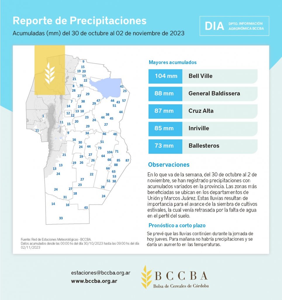 En Córdoba, la Bolsa de Cereales provincial reportó acumulados de entre 60 y 100 milímetros en las últimas horas en el sur y sudeste, y opinó que servirán para impulsar las labores de siembra de cultivos estivales que venían retrasadas.
