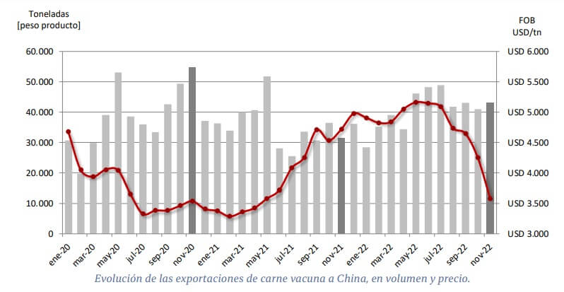 Actualmente, de acuerdo a los datos de exportación de noviembre, el precio promedio de la tonelada exportada se ubica en torno a los U$S 4.200, unos U$S 2.100 menos respecto de aquel máximo alcanzado en abril y casi un tercio menos de lo conseguido un año atrás. Gran parte de esta baja, responde a China.
