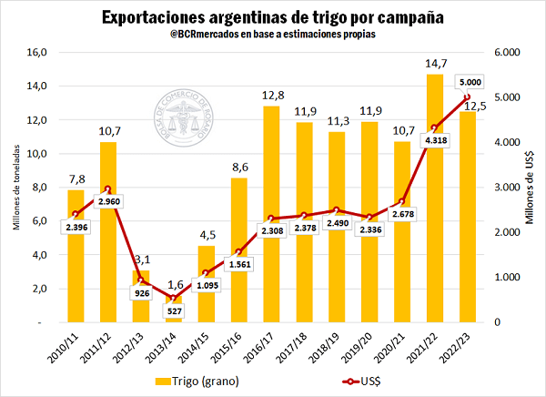 Pero “a pesar del menor volumen exportado que se espera para la nueva campaña, en las proyecciones preliminares los precios FOB del trigo argentino vigentes más que compensan la caída en toneladas. Se espera que el valor exportado por el cereal 2022/23 pueda situarse en el orden de los US$ 5.000 millones, lo que constituiría un máximo en los registros”, señala la BCR.