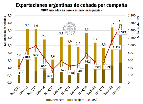 “En base a los precios FOB vigentes para la nueva campaña 2022/23, las exportaciones de cebada cervecera y forrajera estarían en condiciones de alcanzar nada menos que US$ 1.529 millones en la próxima campaña, lo cual también sería la mejor marca de la historia, al igual que el trigo”, agrega el informe.