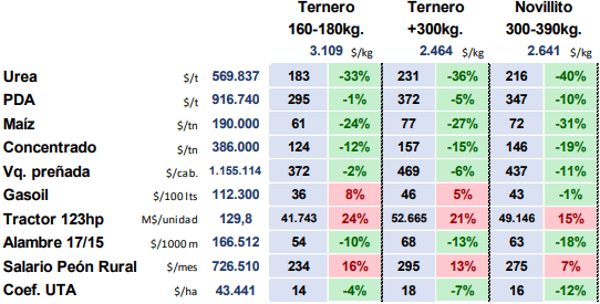 “En consecuencia, si echamos una mirada a los precios relativos, encontraremos lo siguiente: aquellos insumos de la ganadería que tienen valorización en pesos, se encuentran en valores de intercambio cercanos al promedio. Y aquellos otros con mayor peso del dólar en su valuación, los encontraremos más baratos en términos relativos frente al valor de nuestro producto”, menciona.