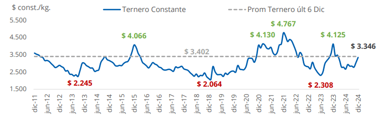 La ventaja para el criador es que esta nueva normalidad encuentra al ternero, el principal producto de quien se dedica a esta “pata” del negocio ganadero, con muy buen precio si se mide en dólares y con valores promedio si se evalúan en pesos constantes de diciembre de 2024.