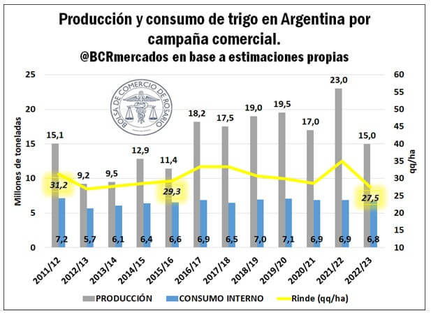 Con el actual mapa productivo clavado en 15 millones de toneladas, la previsión de exportaciones del nuevo ciclo quedará en 9 millones, contra las 15,5 millones que se exportaron del trigo 2021/22, un récord para esa cadena de valor.