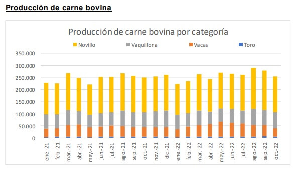 La producción de carne entre enero y octubre alcanzó las 2,58 millones de toneladas, unas 115.000 toneladas superior en comparación al mismo período del año pasado. Al separar por categorías, la carne de vaca creció un 13,3% interanual; la de toros un 10% y la de novillos y novillitos creció un 3,8%