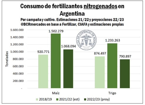 De esta manera, la caída de consumo de fertilizantes fosfatados y nitrogenados en maíz y trigo pasaría de 4 millones de toneladas en la campaña 2021/22 a cerca de 2,9 millones para el ciclo actual, una reducción total de consumo cercana al 28%.