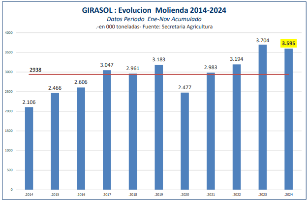 Según el informe de CIARA-CEC, entre enero y noviembre se procesaron 3,59 millones de toneladas de girasol, el segundo volumen más alto de la historia.