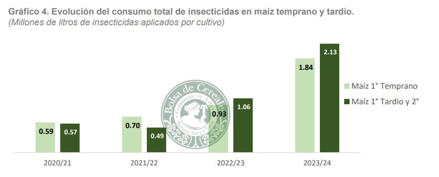 En comparación con campañas anteriores, el informe de la BCBA estimó un incremento en el uso de insecticidas, tanto en siembras tempranas como tardías. En relación con la campaña 2022/23, el uso total de estos productos creció un 99%, con un mayor consumo en los maíces de siembra tardía.