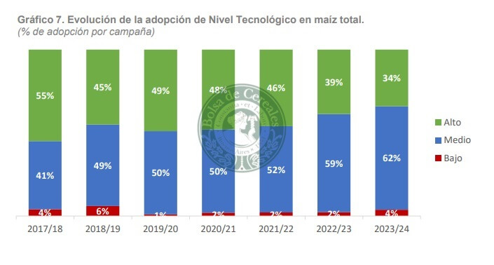 🚦 Nivel Tecnológico: El nivel tecnológico promedio nacional para el cultivo de maíz en la campaña 2023/24, se distribuyó en: