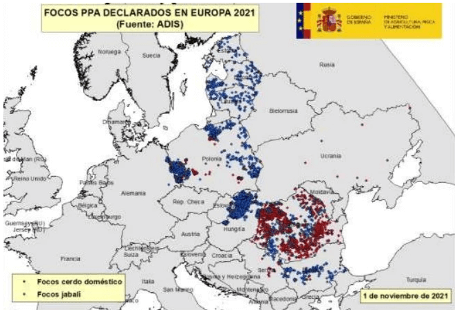 Los casos silvestres más preocupantes se encuentran en Polonia (12.273 casos), Hungría (8.267), Letonia (4.335) y Lituania (4.073); mientras que a nivel doméstico los países con más positivos informados son: Rumania (5.433), Polonia (483) y Lituania (141).