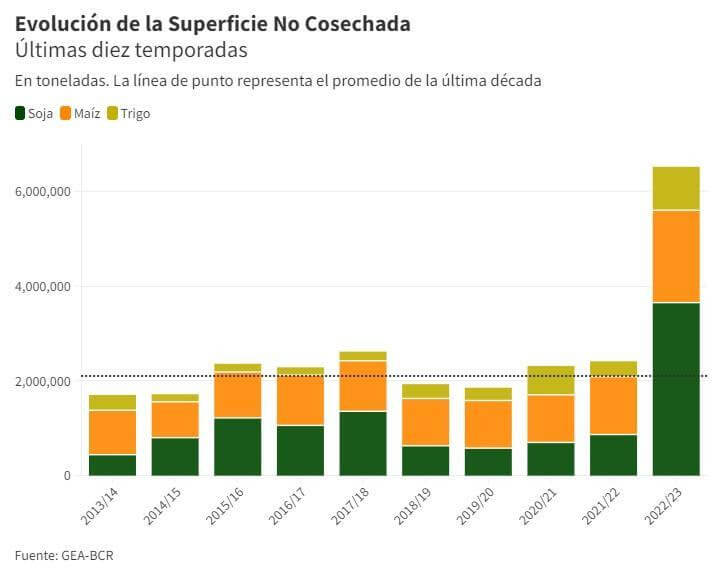 Entre soja, maíz y trigo, fueron 6,5 millones de hectáreas las que no se pudieron cosechar principalmente por la falta de agua, lo que equivale al triple del promedio de la última década, que apenas supera los 2 millones de hectáreas.