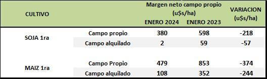 Y completa: “Para el caso de la soja de primera, aún con un plus climático y un 25% más de rinde, en campo propio seguiría debajo de enero 2023 en U$S 33. Solo en caso de alquiler da vuelta el partido y terminaría generando un ingreso extra de U$S 141”.
