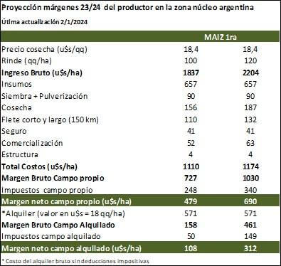 “Lamentablemente, la conclusión es que el 20% de aumento en producción por clima en maíz de primera no compensarían los resultados promedios valorizados a enero del 2023. Para campo propio el margen seguiría estando por debajo en U$S 163 y en U$S 40”, resume la GEA.
