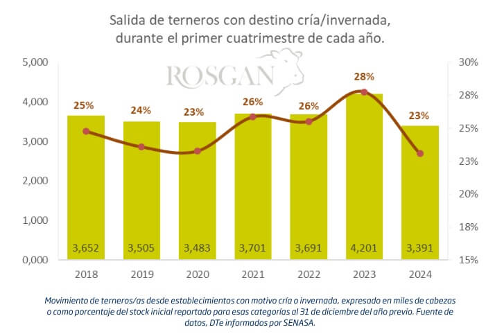 Los números permiten ratificar esta tendencia. En los primercos cuatro meses de 2024, de las 3,4 millones de cabezas livianas que salieron de los campos para continuar en crías o invernada, unas 759.000 (22,4%) ingresaron a corrales. Esto se ubica un punto arriba en relación el año pasado, cuando los engordadores eran casi la única alternativa viable para la recría y engorde.