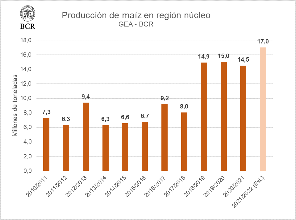 “No hace mucho, entre el 2010 y el 2015 la región núcleo producía, en promedio, tan solo 7 millones de toneladas por año. El ciclo 2021/22 plantea un salto de 10 millones de toneladas más que en aquella época”, finaliza el informe.