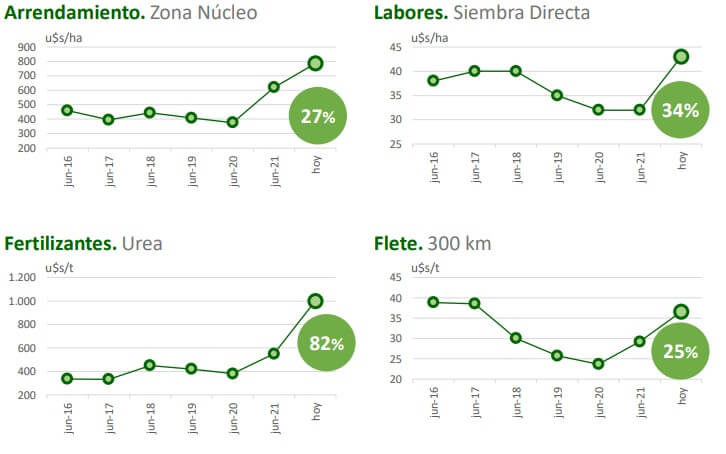 En el trabajo midieron las subas de costos, en relación a junio del año pasado. Entre otros ítems, calcularon que el el costo de arrendamiento en zona núcleo creció 27%; glifosato y urea subieron 165% y 82% respectivamente y un flete de 300 kilómetros se encareció en un 25%.
