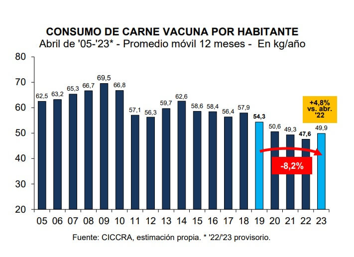 En este contexto, el consumo a nivel nacional en abril fue de 49,4 kilos por habitante, un 4,8% más en comparación al mismo mes del año pasado.