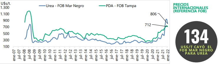 Para el caso de los fosfatados, dice el trabajo, en el primer mes del año el valor global de referencia retrocedió 30 dólares por tonelada, respecto a diciembre. “El mercado se muestra sostenido”, destaca, sobre un valor que se ubica en los 712 dólares por tonelada. Dentro de este contexto, agrega, Sudamérica está retirada de la demanda por estacionalidad, a lo que se suma también el factor sequía.