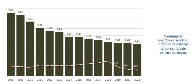 (1,64 millones) de los novillos registrados en stock, en 2020 ese porcentaje se redujo a menos del 50%, mientras que en 2021 se restringió a menos del 42% del stock.