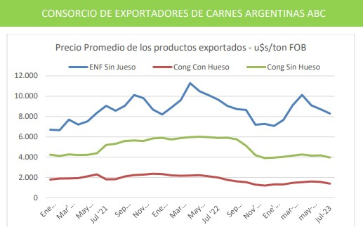 En los primeros siete meses de 2023, las exportaciones de carne vacuna crecieron un 9,3% interanual en volumen y retrocedieron un 20,9% en facturación, de acuerdo al Consorcio Exportador de Carnes ABC.