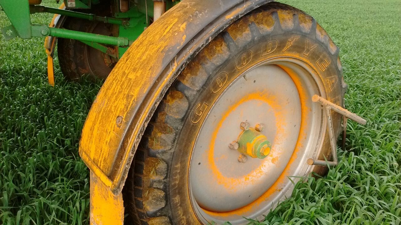 Maquinaria contaminada por roya amarilla a principios de la temporada de crecimiento, Septiembre 2017, Los Cisnes, La Carlota, Cordoba, Argentina. Foto: Ing. Agr. Juan Pablo Ioele.