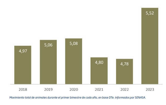 En tanto, el Rosgan también advierte en su reporte semanal que la seca sigue pegando muy fuerte y acelera la salida de hacienda de los campos: de acuerdo a datos provistos por el Senasa, en los primeros meses del año, el movimiento total de hacienda que salió de los establecimientos hacia todo tipo de destino fue el más alto de los últimos seis años, superando los 5,5 millones de animales, unos 750 mil animales más que los trasladados reportados en igual bimestre del último año.