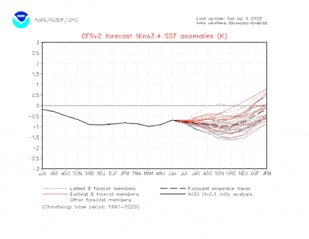 El mismo trabajo advierte que, en la tendencia de largo plazo, se puede ver que los principales modelos muestran que se mantiene el enfriamiento de la temperatura del Pacífico central durante los próximos meses, lo que daría como resultado la permanencia hasta fines del invierno, e incluso seguiría la situación, continuando durante toda la primavera. La mayoría de las estimaciones coinciden en que la campaña 22/23 seguirá signada por este fenómeno.