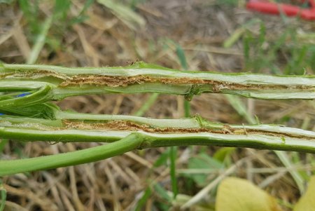a larva emerge después de 2 ó 3 días de la oviposición e inicia la infestación empezando por la nervadura más próxima y continúa avanzando a través del pecíolo dentro del tallo, formando galerías en partes o en toda la extensión.