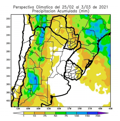 En relación a las precipitaciones, éstas se concentrarán en el oeste del área agrícola dejando a Buenos Aires, el sur de Santa Fe y Entre Ríos, prácticamente sin lluvias.