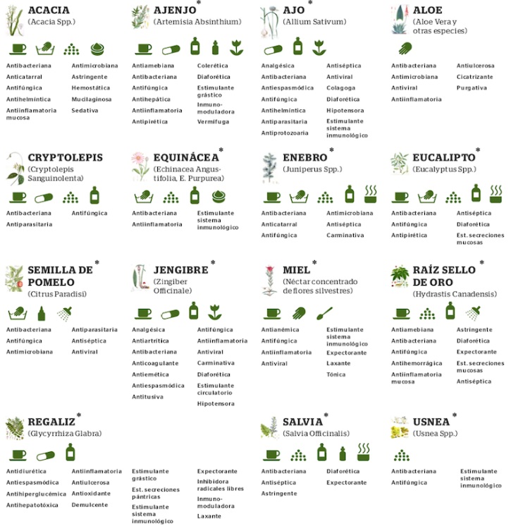 Esta es la lista creada por Stephen Buhner, autor del libro Herbal Antibiotics: Natural Alternatives for Treating Drug-Resist Bacteria de los productos más recomendados: