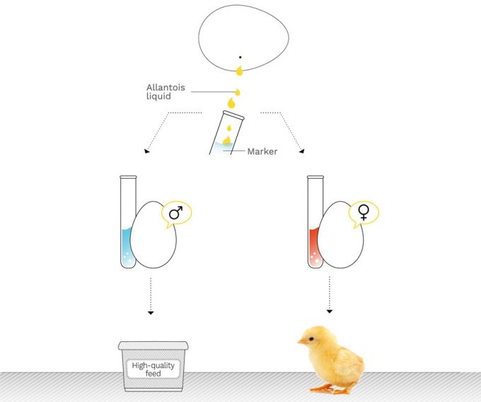 El mismo se trata de un proceso patentado adaptado al sistema industrial, que permite la identificación endocrinológica de género en los huevos, evitando que se tenga que sacrificar a los pollitos macho como lleva a cabo actualmente la industria avícola.