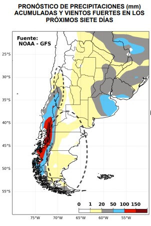 “El avance de sucesivos sistemas frontales ocasionará lluvias entre lunes y viernes en Neuquén y Rio Negro (con posibilidad de nieve), La Pampa, Buenos Aires, Entre Ríos, Santa Fe, Córdoba, San Luis, Mendoza, NEA y algunas localidades del NOA. Entre sábado y lunes se esperan algunas lluvias aisladas en localidades del NEA, zona cordillerana de Mendoza y también algunos eventos en Córdoba”, resume la ORA.