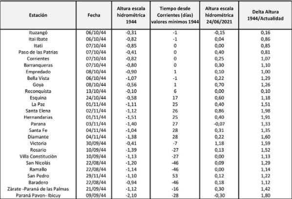 Con la tendencia prevista, todo el tramo del río en territorio argentino alcanzaría niveles similares o peores que los registrados en 1944, el año más bajo del río, desde que se tienen registros, desde 1884 (Ver tabla).
