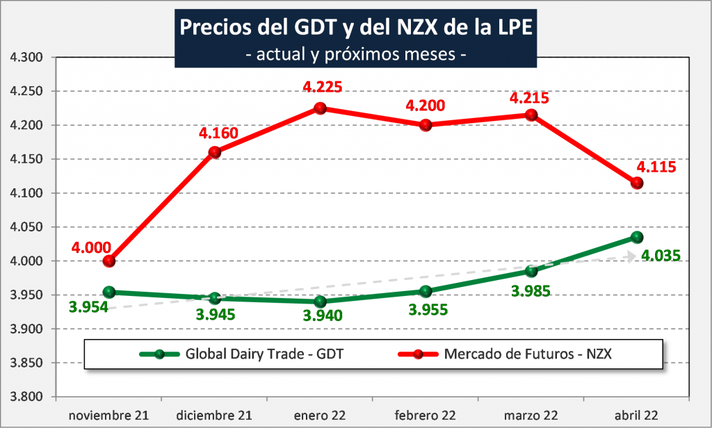 Para el caso de los futuros en el mercado New Zealand’s Exchange (NZE) la última subasta mostró una cotización de la LPE de 4.000 u$s/tn, quedando 45 dólares por encima del GDT.